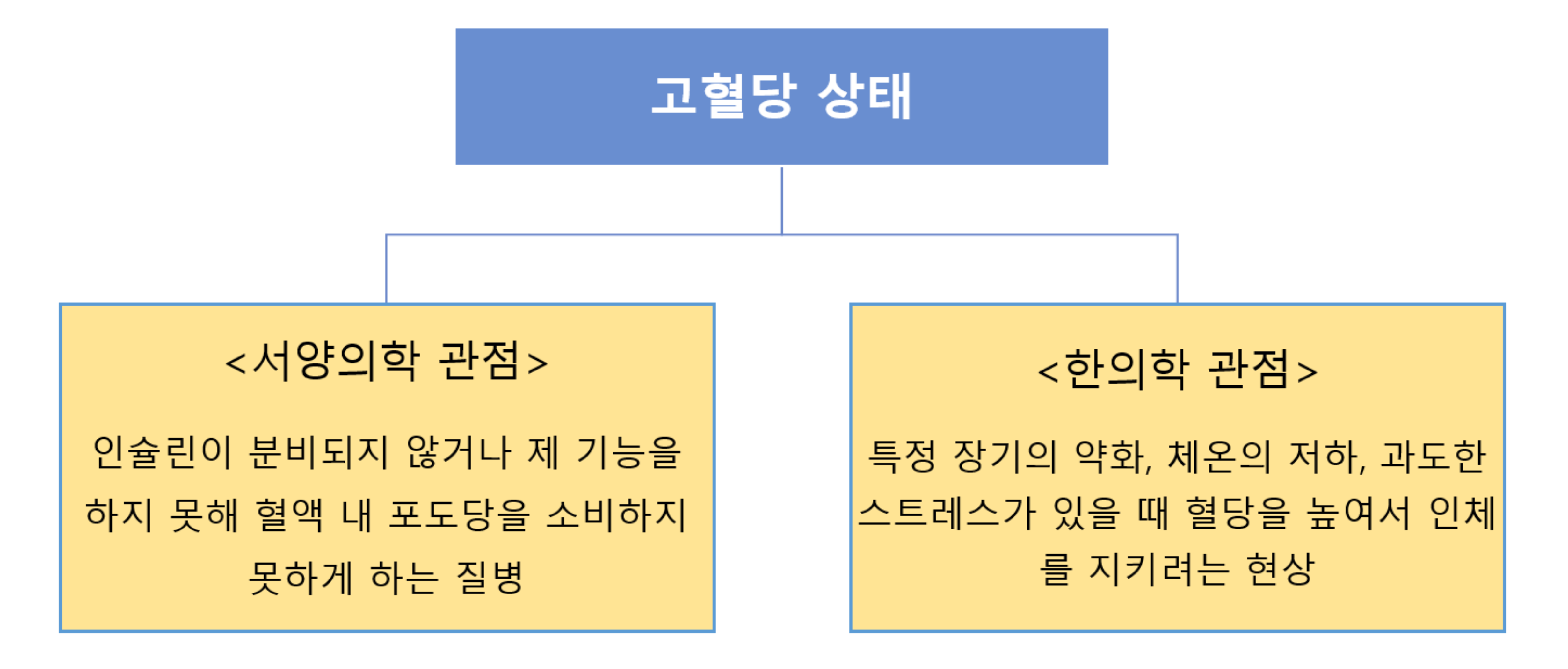 이렇게 서양의학은 혈당이 높으면 질병으로 보지만, 한의학에서는 인체를 지키고 치유하려는 정상적인 생리 현상으로 봅니다.