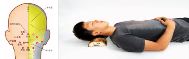그림과 같이 후두부 혈자리를 중심으로 척추경혈운동기를 베고 누운 후, 천천히 고개를 좌우로 움직이면 13개의 경혈이 소통되고 근육의 경혈도 풀립니다.
