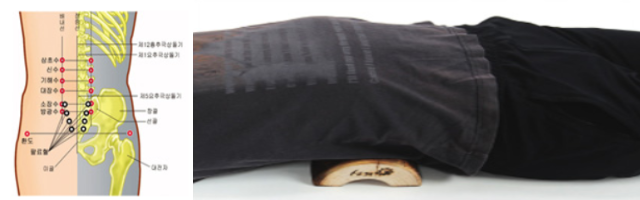 그림과 같이 요추부 혈자리를 중심으로 척추경혈운동기를 대고 눞습니다.
