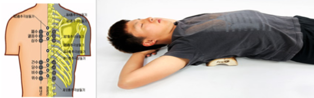 그림과 같이 흉추부 혈자리를 중심으로 척추경혈운동기를 대고 눞습니다.