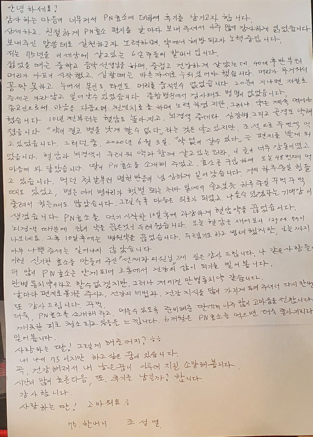 안녕하세요. 감사하는 마음이 너무 커서 PN효소에 대하여 후기를 남기고자 합니다. 상세하고 친절하게 건강편지를 날마다 보내주셔서 아주 많이 감사하게 읽었습니다. 보내주신 말씀대로 실천하고자 노력하며 약에서 해방되고자 노력중입니다. 저는 75년을 이 세상에서 살고있는 6명의 손주들의 할머니 입니다. 젊었을 때는 중학교 음악 선생님을 하며 즐겁고 건강하게 살았는데, 40대 후반부터 머리가 아프기 시작했고 심할때는 바른자세로 누워있어야 했습니다. 머리가 무거워서 꼼짝 하지 못하고 누어있는 상태에서 본인도, 타인도 머리를 움직일 수 없었습니다. 20분이 지나면 저절로 증세는 가라앉고 일어날 수 있었습니다. 종합병원에서 검사해도 병명이 없었습니다. 종교인으로서 마음을 다듬으며 천연치료를 하며 노력하였지만, 약은 계속 먹어야 했습니다 . 10년 전부터는 혈압도 높아지고 뇌경색 증세와 심장병, 그리고 골격도 약해졌습니다. "약이 결코 병을 낫게 할 수 없다!"라는 것은 알고 있었지만, 조석으로 두번씩 약을 먹고 있었습니다. 그러던 중, 2020년 6월3일, "약 없이 살 수 있다"는 편지를 받게 되었습니다. 혈압과 뇌경색이 두려워 약과 함께 살고 있는 터라, 이 글이 너무 감동이였고 마음에 와 닿았습니다. 딸이 PN효소를 구매해 주었고, 오늘48일째 먹고 있습니다. 먹던 첫날부터 명현반응이 너무 심하게 일어났습니다. 거의 하루 종일 꾸벅꾸벅 졸려서 힘들때도 많았습니다. 그럴수록 마음은 위로가 되었고 나을 수 있겠다는 기대감이 생겼습니다. PN효소를 먹기 시작한 10일 후에 과감하게 혈압약을 끊었습니다. 뇌경색 때문에 약을 먹지 않는 다는 것이 많이 두려웠습니다. 오늘 혈압을 재어보니 127에 77이 나오네요. 혈압약을 끊은 10일 후에는 다른 병원 약들을 끊었습니다. 두렵기도 하고 염려도 되었지만, 오늘까지 아무 나쁜 증세는 일어나지 않았습니다. 이런 신기한 효소를 만들어 주신 "선재광 의원님"께 깊은 감사를 드립니다. 나 같은 사람들이 더 많이 PN효소를 알게되어 고통에서 건강한 삶을 찾게 되기를 빌어 봅니다. PN효소가 만병통치약이라고 할 수 없겠지만, (피를 맑게하고 체온을 높여 내 몸이 만병통치가 가능한 상태로 만들어 주니) 저에게는 만병통치약 같이 느껴집니다. 날마다 편지로 용기를 주시고 건강의 비법과 건강 지식을 많이 가지게 하여 주셔서 다시 한번 또 감사드립니다. (꾸벅) 또한 PN효소를 소개해 주고 먹을 수 있도록 준비해 준 딸에게 아주 많이 고마움을 전합니다. 깨끗한 피로 청소되고 있음을 느낍니다. 6개월 정도 PN효소를 먹으면 더욱 좋아지리라 믿습니다. 사랑하는 딸, 그렇게 해줄꺼지? ㅎㅎ 내 나이 75이지만, 아직 하고 싶은 꿈들이 있습니다. 꼭 건강해져서 내 남은 꿈이 이루어 지길 소망해 봅니다. 시간이 많이 흐른다음, 또 후기를 남길까 합니다. 감사합니다. 사랑하는 딸, 고마워요^^! 75세 할머니 조성열